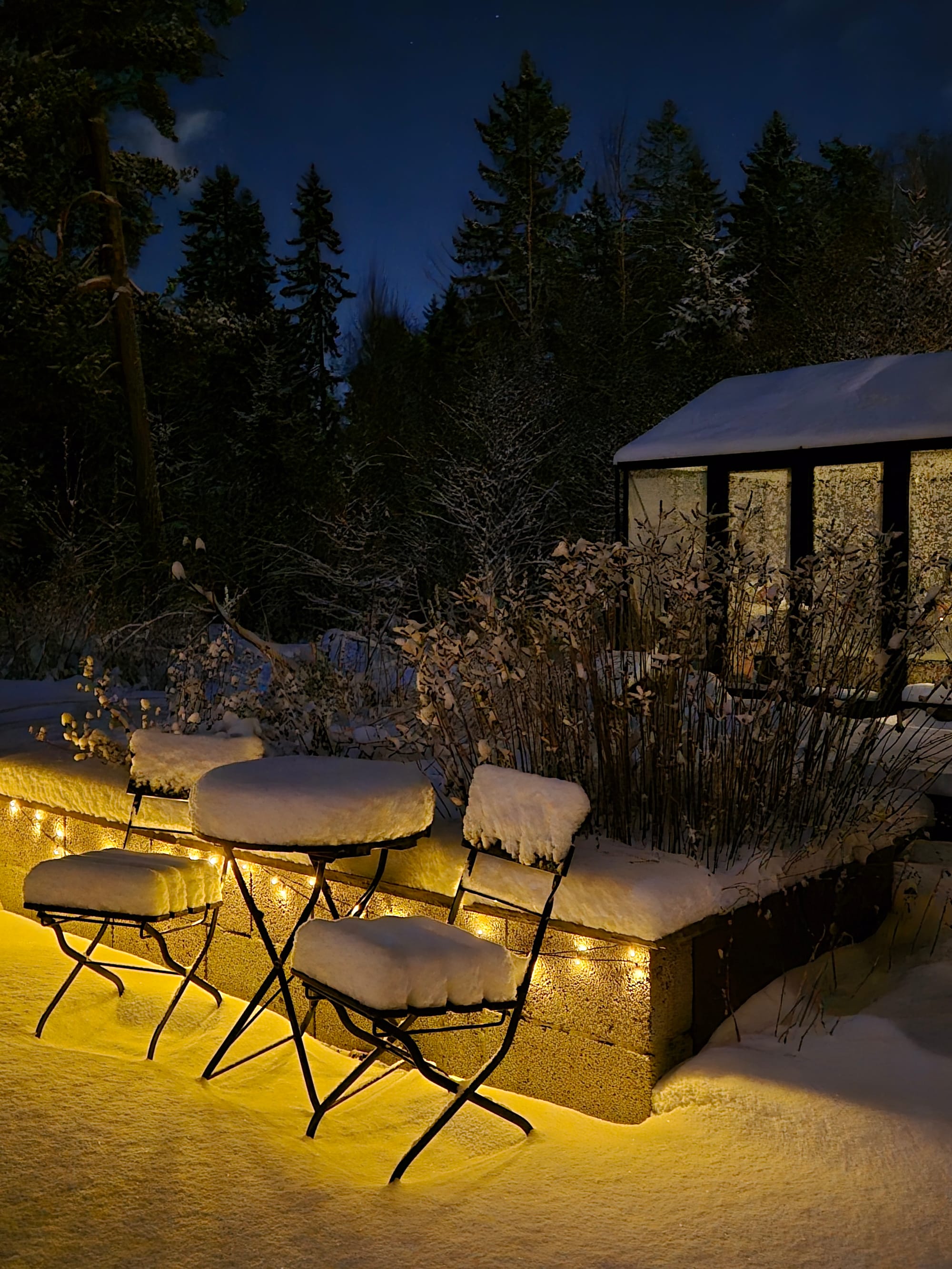 Her inne som jeg sitter er det varmt og fyr på peisen, ute har kuldegradene krøpet nedover og tallene på gradstokken er tosifret. Himmelen har mørknet og hagen ligger i et trollsk lys fra månen og stjernene. Det har kommet litt snø de siste dagene og hagen ligger i vinterdvale. Foreløpig har verken rådyrene eller jeg tråkket stier i snøen og det er en egen ro og stemning over hagen som en ikke opplever ellers i året.